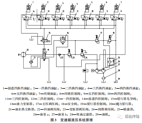 此變速箱液壓系統(tǒng)有 2 個油泵 26 和 27,吸油前均先經(jīng)過吸油過濾器 28,油泵 27 提供的液壓油經(jīng)過精濾器 25 后給換擋系統(tǒng)和變矩器供油,安全閥 18 保證液壓油壓力小于 2. 8 MPa。當換擋回路中擋位控制閥 (8 ~ 19) 打開時,液壓油通至換擋油缸 (1 ~ 6) 實現(xiàn)換擋。需要閉鎖時,液力變矩器閉鎖控制閥 8 打開,液壓油通至前進擋換擋油缸 1 實現(xiàn)變矩器閉鎖。油泵 26 直接將液壓油提供至變速箱的潤滑系統(tǒng),潤滑調(diào)壓閥 24 保證潤滑壓力小于 0. 3 MPa,多余的液壓油通至液力變矩器。