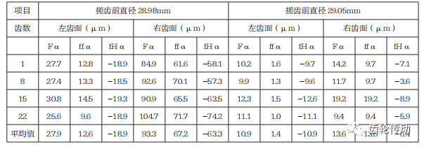 兩個工件的第 1、8、15、22 齒對應的 Fα、 ffα、fHα 值見表 2,此時相關誤差數值顯著減小。實際加工中可根據毛坯材料、待加工花鍵的具體特征、加工設備及刀具等適當調整,以確保加工出高質量的漸開線花鍵。針對齒形、齒向方向產生的異常凸點,可仔細檢查搓齒板每個齒上是否沾有雜質、加工中使用的冷卻油是否污染,過濾系統是否堵塞,以上問題解決后,齒面異常凸起可自然解決。齒向形狀超差是指齒面形狀在導程方向誤差大。遇到此類問題可先查看花鍵是否帶螺旋角,對應的搓齒板螺旋角是否一致,螺旋角旋向是否正確。如刀具正確仍然出現如下問題,可檢查刀具正面安裝精度,將搓齒機調整至點動模式,檢查正面安裝面的跳動,通過調整該安裝面的跳動至 2 絲內,即可消除齒向形狀超差問題。當然刀具各個安裝基準面的清潔度在任何時候都非常關鍵,會對花鍵質量產生較大影響。