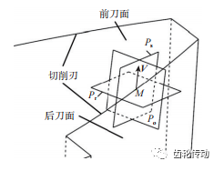 車齒切削角度:首先選定車齒刀具切削刃上一點 M,建立刀具角度基準平面,如圖 5 所示。假設切削刃點 M 處的切削速度為V,則基面 Pr垂直于切削速度V ,切削平面Ps 由切削速度V和 M 處的切向量 q組成,主截面 Po同時垂直于基面 Pr和切削平面Ps。