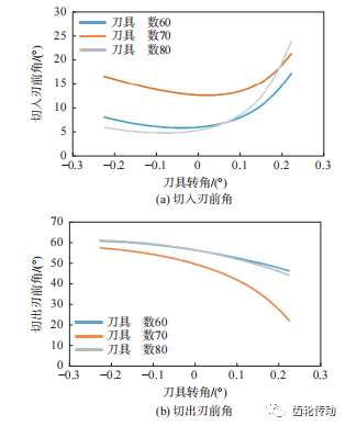 在工件齒數不變的情況下,改變刀具齒數主要影響傳動比,從而改變工件相對刀具的切削速度。圖 8 為刀具齒數對切削前角的影響。可見,刀具齒數對于刀具前角的影響無明顯規律,而前角隨刀具轉動過程的變化趨勢基本相同。