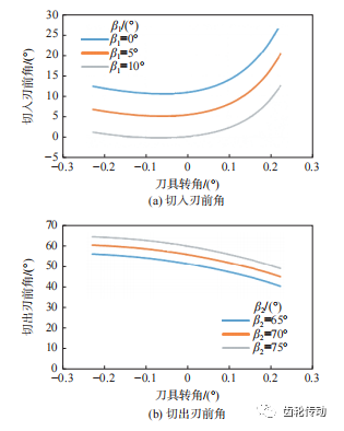 圖 9 為刀具螺旋角β對切削前角的影響。可見,β1 增大會導致負前角出現,而 β2減小則會導致負前角出現。因此,在設計面齒輪車齒刀時,應嚴格控制 β1、β2的大小。