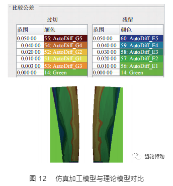 利用 VERICUT 提供的“自動比較”功能分析刮齒加工后面齒輪與標準面齒輪的齒面偏差。由圖 12 可以看出,刮齒加工仿真得到的面齒輪模型與理論模型存在一定的差距,具體表現為面齒輪齒根處發生過切和面齒輪齒頂處發生殘留,最大過切及殘留量約為 0.05 mm。產生這一結果的主要原因是:由于刮齒刀結構前角的存在,使得刀具切削刃并非理論的漸開線,刀具前角給加工引入了一定的誤差。