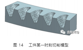 利用 VERICUT 軟件,可以得到加工過程中某一時刻的工件模型。在 DEFORM 軟件中,只需預先給刀具施加一個軸向位移,就可以模擬刀具在下一次進給時的切削情況。圖 14 為從 VERICUT 軟件中提取的工件車齒過程中某一時刻的切削模型。