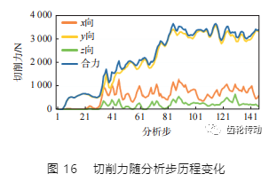 通過分析步驟歷史,得出了車齒過程中刀具切削力的變化規律,如圖 16 所示。可以看出,刀具在 y 方向(工件徑向)受到的力最大。為了粗略估計車齒過程的平均切削力,取第 80 步分析后刀具切削力的平均值作為車齒過程刀具切削力的估計值,此處計算的平均切削力為 3 247 N。