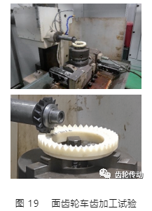 車齒加工試驗:在面齒輪專用數控加工機床上開展了面齒輪車齒加工試驗,如圖 19 所示。面齒輪樣件采用樹脂材料,通過控制刀具軸和工件軸定比例轉動,同時附加刀具一個徑向的位移,實現了面齒輪的車齒加工。試驗初步驗證了面齒輪車齒加工方法的正確性,后續還需開展針對鋼材料的面齒輪車齒加工,以研究車齒加工參數對實際加工過程的影響規律。