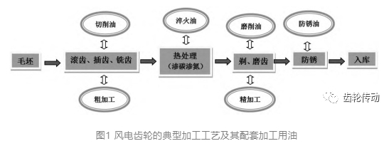 風電齒輪加工的典型工藝流程及其配套所用的加工用油見圖1。