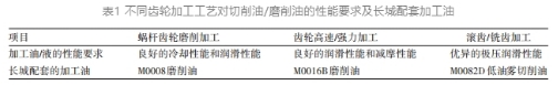 不同齒輪加工工藝對切削油/磨削油的性能要求及長城配套加工油見表1。