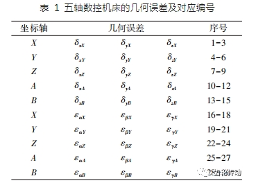 為便于分析,將幾何誤差序列進行編號,如表 1 所示。其中 ε 代表角度誤差,δ 代表線性誤差,誤差變量通過兩個下標進行區(qū)分:第一個下標代表誤差的方向,第二個下標表示誤差所在的軸。例如:εαY表示 Y 軸在 α 方向上的角度誤差, εyX表示 X 軸在 y 方向上的線性誤差。