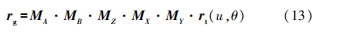 工件齒輪的展成運動由 X、Y、Z、A 和 B 五個軸共同確定。所以 A 軸到 Y 軸的齊次變換矩陣與刀具方程聯(lián)立可以得到理想狀況下的齒面方程 rg。