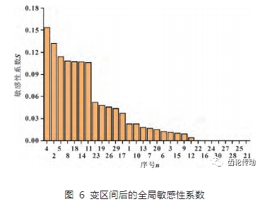 通過 Sobol 全局敏感性分析方法可以求解出 30 項機床幾何誤差的全局敏感性系數(shù),按照全局敏感度系數(shù)大小降序排列,如圖 5 所示。
