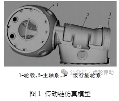 本文使用精益傳動計算軟件,以某機型為研究對象,建立了輪轂、主軸系(包含主軸、軸承座、主軸承、支架)以及第一級行星輪系的一體化傳動鏈仿真模型,如圖1所示。在輪轂中心施加六自由度載荷,軸承座與第一級齒圈連接,主軸與第一級行星架連接,第一級行星輪系為 NGW 形式的直齒傳動。