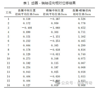 為了定位第一級行星輪系齒輪嚙合最差的狀態,輪轂中心施加六自由度載荷進行仿真分析。在輪轂中心載荷的作用下,主軸變形帶動第一級行星架、行星銷軸變形,軸承座帶動第一級齒圈變形,齒輪嚙合引起第一級齒圈、行星輪銷軸變形,綜合因素影響下得到第一級齒圈與行星銷軸的徑向相對變形量,如表1所示。