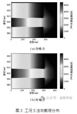 施加工況5六自由度載荷后,得到齒面法向載荷分布,如圖3所示。齒面接觸法向載荷沿齒寬方向由上風向齒端往下風向齒端逐漸降低,出現了載荷分布不均現象。內嚙合最大單位長度法向載荷為5417N/mm,外嚙合最大單位長度法向載荷為4766N/mm。