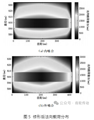 未修形前內外嚙合的法向載荷分布,如圖3所示,第一級行星輪系內外嚙合上風向齒端位置接觸載荷較大,都存在一端局部接觸偏載現象。修形后的法向載荷分布如圖5所示,內外嚙合載荷由中間向兩邊遞減,呈對稱分布,極大的改善了未修形前的內外嚙合偏載現象,承載寬度增加,整個齒寬均有載荷分布。內嚙合最大單位長度法向載荷 為 2979N/mm,外嚙合最大單位長度法向載荷為 3043N/mm,與未修形圖3相比,得到了大大降低。