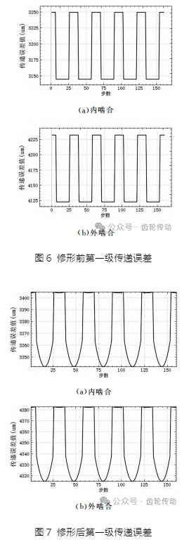 修形前第一級行星輪系傳遞誤差,如圖6所示,內嚙合最大傳遞誤差為 105μm,外嚙合最大傳遞誤差為 109μm。修形后傳遞誤差,如圖7所示,內嚙合最大傳遞誤差為63μm,外嚙合最大傳遞誤差為68μm。內嚙合傳遞誤差降低了42μm,外嚙合降低了41μm。通對比修形前后的傳遞誤差可以得知,修形可以大幅降低行星輪系的傳遞誤差,對齒輪箱的動態性能有很大的改善。