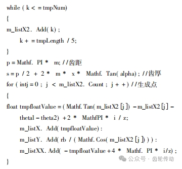 多功能試驗系統底層算法數學建模:通過數學建模工具 AlgDesigner V3.0 的二次開發,將齒輪幾何參數、基本尺寸計算及輪廓線生成編譯轉化為底層運算代碼,為程序調用提供底層數據支撐,實現齒輪機構尺寸自動化計算功能。以下是編寫的部分齒輪輪廓線自動生成的底層算法數學建模代碼段。
