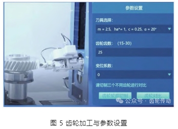 該模塊中設計了虛擬齒輪測量儀器設備,可在線進行齒輪幾何尺寸的隨機數據測量、數據采集、數據分析與處理,強化工程師對齒輪參數測量方法的掌握,研究不同精度下加工的齒輪對齒輪傳動系統的影響及齒輪精度選擇的重要性。對(2) 中加工完成的齒輪主要參數值進行測量與計算,并填入圖 6 中右側的齒輪參數測量欄中: m = 2.505,分度圓直徑 d = 62.5,全齒高 h = 5.64,齒距 p = 7.85,齒厚 s = 3.91,齒頂圓直徑 da = 67.56,齒根圓直徑 df = 56.24,測量和計算結果與(1) 中的齒輪設計尺寸基本一致,驗證了測量工具設備測量的準確性。