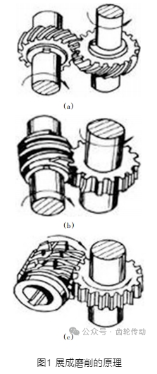 在現階段齒輪磨削加工中,依據砂輪和相對齒輪的運動軌跡,可以分為展成磨削和成形磨削兩類加工方法。其中,展成磨削(Generating Grinding)是其原理是利用砂輪和齒輪的嚙合運動,將砂輪的切削刃與齒輪的齒形相接觸,從而切削出齒輪的齒形,如圖1所示。由于該方法屬于嚙合運動,砂輪的切削刃可以精確地按照齒輪的齒形軌跡進行切削,并且砂輪的切削刃與齒輪的齒形相接觸,能夠有效地去除材料,所以具有較高的加工精度和加工效率,可以適用于各種類型的齒輪,包括直齒、斜齒、弧齒等,適用范圍較廣。