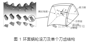 圖 1 是環(huán)面蝸輪滾刀及其單個刀齒的結構。環(huán)面蝸輪滾刀的刀齒主要包括側后角面、前刀面、刃帶面、刃口線和刃帶線。側后角面是刃帶線后面的部分,具有一定的側后角面角度 α。側后角 α 是向量 ns 與 nH 向量之間的夾角。其中 ns 是刃帶線上任一點 P1 在基本環(huán)面蝸桿螺旋面上的法矢量,nH 是點 P1 在側后角面上的法矢量。