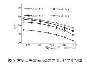 圖 9 是 θLi 隨環(huán)面半徑的變化情況繪制成曲線圖,通過分析可知,對于左側后角面,各個刀齒展成出的側后角面的形狀呈現(xiàn)上小下大的趨勢,同時,左側面入口刀齒 T1 處的齒根環(huán)面部位的夾角 θL1 值最小,該處是在展成齒頂的側刃帶時產生的。因此展成 T1 刀齒左側后角面時,展成齒頂刃帶時最容易造成展成干涉。