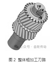刀路軌跡的簡潔、整齊會使得機床在運行過程中更加平順,工件表面的加工效果也會更好。此處選擇新版 UG 中的策略———旋轉部件的粗加工,在類型中選擇 mill_rotary,子工序中選擇旋轉部件的粗加工,此工序是為具有旋轉性質的部件量身定制的,它將使用球頭銑刀、圓鼻銑刀或平底刀按圓柱層進行切削,并且自動擺正刀軸使其與切削層垂直。由于整個粗加工過程需要用到四把刀具,每把刀具的切削深度不同,因此需要通過幾何體選項卡中的限制加工范圍來管理每把刀具的切削層,分別設置軸向范圍和徑向范圍。切削層設置完成后設置步距與切深,然后由軟件自動生成加工刀路,但刀路生成后會產生一些多余刀路,影響整體加工效果,此時應對加工參數中的步距與切深進行微調,直至產生的刀路整齊且平順。單個齒槽刀路生成后,通過刀路的鏡像和繞直線旋轉的變化,可得到全部 46個齒槽的粗加工刀路。整體開粗刀路如圖2所示。