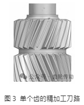最終的精加工刀路在保證刀軌均勻、平順的基礎上還需要保證每刀切削都是順銑狀態,而單一面的順銑必須經過提刀,然后進行單向銑削,這樣加工效率較低。此處針對兩個相鄰齒輪進行過渡圓弧面連接,使其形成一個封閉輪廓,再使用切削策略中的可變輪廓銑命令,切削區域與驅動曲面都選擇兩齒面與過渡圓弧面,切削模式選擇螺旋,數量設置為50刀,精加工刀路如圖3所示。此處需要注意,精加工刀路在鏡像變換過程中應當勾選保持切削方向,否則鏡像完成后的刀路切削方向與原刀路相反,即變為逆銑刀路,影響加工質量。