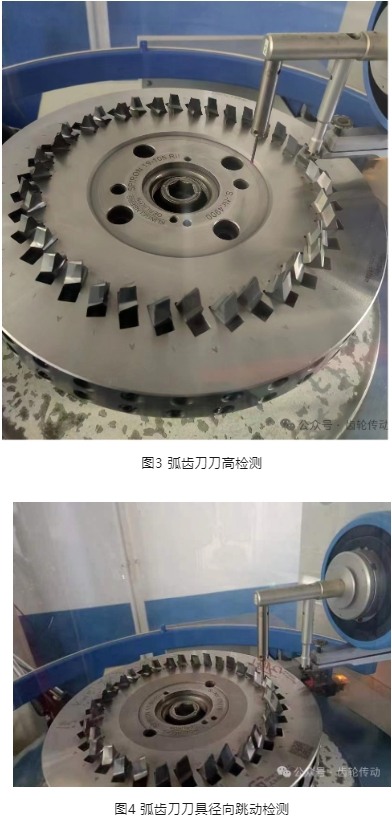銑刀、涂層刀頭、拉刀、刀盤刀具的刃磨精度和裝刀精度會直接影響到加工齒輪的精度,刀具在加工過程中要盡量減少刀高跳動和徑向跳動。使用刀具要具備高硬度、高耐磨性,和高強度韌性,耐熱性和工藝性能經濟性。在實際生產中徑向跳動≤0.025mm,刀高跳動≤0.025mm,對于弧齒錐齒輪來說無論是內刀或是外刀,刀高和徑向跳動均如此要求,具體檢測部位及檢測方法及檢測結果如下圖所示。