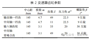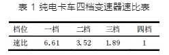 變速器共有 4 個檔位,其中四檔為直接檔,倒檔為一檔時驅動電機反轉來實現。齒輪為漸開線斜齒輪,最大輸入扭矩為 1 000 N·m,最大輸入轉速為 3 100 rpm,各檔速比見表 1。