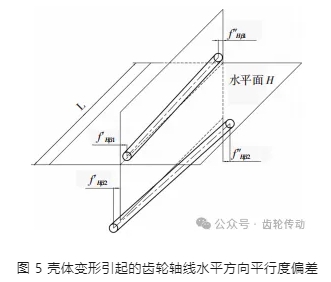 該模型中殼體變形引起的齒輪軸線水平方向平行度偏差如圖 5 所示,計算公式歸納為