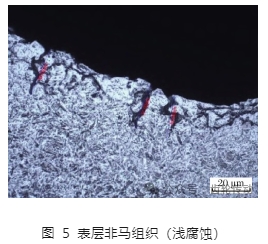 斷裂的齒輪根部表面存在網狀非馬氏體組織,測試其深度約為 0.04 mm(圖 5)。滲碳(碳氮共滲)在淬火后零件表面理想的組織應該為細針狀高碳馬氏體,但因為熱處理工藝及加工工藝等工序諸多不可控的因素,在齒輪表面形成了貝氏體、屈氏體(珠光體類)等一些非馬氏體的混合組織,造成了嚴重的質量缺陷。非馬氏體組織深度如果超標嚴重,在力學性能上就會出現零件表面硬度低的現象,影響硬度梯度,出現測試硬度不均勻的結果。