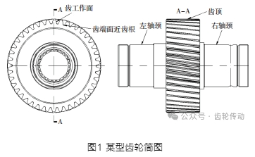 某型號齒輪齒數 42,模數 2.5,材料為鍛 9310,齒部及兩端軸頸滲碳層 0.6~0.9mm,表面硬度 HRC ≥ 60,齒形公差 0.006,齒向公差 0.007,兩端軸頸要求圓度 0.005,相互同軸度 Φ0.006,如圖1所示。該零件在滲碳淬火后精磨削工序中出現燒傷裂紋現象。磨削裂紋普遍存在于齒頂、齒端面近齒根處和兩端軸頸。