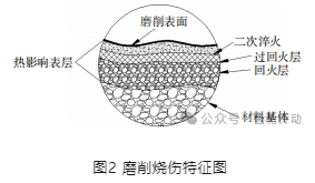 磨削燒傷產生后,基體表面的金相組織發生明顯的變化,就淬火鋼而言,其磨削燒傷特征如圖2所示。根據磨削瞬時產生溫度的高低,磨削燒傷的表層一般可分為回火燒傷(回火層)、淬火燒傷(過回火層和二次淬火層之間)和退火燒傷(二次淬火層和磨削表面之間)。