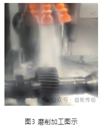 為解決此件的磨削燒傷問題,同時探索變量因素對磨削燒傷的影響,開展磨削加工試驗。試驗試樣直接采用新的零件,設備采用高速萬能數控磨床(哈挺 HG-1000U), 砂輪選取立方氮化硼蝶形砂輪,冷卻液采用 QuakerCool 3750。磨削加工如圖3所示。試驗中以齒端面和軸頸為加工對象,分別從砂輪線速度、工件的速度、磨削進給量、砂輪的修整頻率、冷卻液噴射角度等方面進行加工調試。加工方式采用往復循環磨削模式。