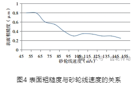 砂輪線速度對磨削的影響,體現在磨削熱量。砂輪線速度越低,砂輪磨損越嚴重,生產率底,砂輪與工件單次接觸的時間就越長,單次產生的總接觸磨削熱量就越多,若磨削熱量沒有及時帶走,就易產生磨削燒傷。若砂輪線速度過高,磨粒切削刃鋒利程度下降,磨削不及時休整砂輪,就容易產生磨削燒傷。控制砂輪線速度,使單位時間產生的磨削熱量越低,帶走熱量越快,工件產生燒傷的概率就越低。工件速度 6m/min,磨削量 20μm,砂輪線速度與表面粗糙度的關系如圖4所示。