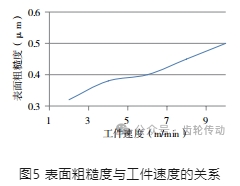 工件的旋轉速度對表面粗糙度的影響剛好與砂輪線速度的影響相反,增大工件速度時,單位時間內通過被磨表面的磨粒數減少,表面粗糙度值將增加,同時單位時間內磨削區域將增大,接觸的磨削熱量就越多,易出現磨削燒傷。砂輪線速度100m/s,磨削量20μm,工件速度與表面粗糙度的關系如圖5所示。