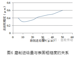 磨削進給量越大,單位時間磨削接觸面積越多,被磨表面的粗糙度越大,產生的磨削熱量越多,易出現磨削燒傷。砂輪的縱向進給減小,工件表面的每個部件被砂輪重復磨削的次數增加,被磨表面的粗糙度值將減小,零件的表面粗糙度增加。砂輪線速度100m/s,工件速度6m/min,磨削進給量與表面粗糙度的關系如圖6所示。