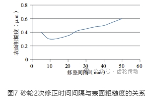 磨削時間過長,工件材料過硬,砂輪失去自銳性,砂輪表面出現磨粒鈍化、砂輪表面空隙堵塞、外形失真等現象時,必須及時修整。修整的次數越多,砂輪單次加工時間就越短,砂輪表面出現磨粒鈍化速度就越低,零件表面的粗糙度就越高,工件出現燒傷的概率越低。砂輪線速度100m/s,工件速度6m/min,磨削量20μm,砂輪2次修正時間間隔與表面粗糙度的關系如圖7所示。