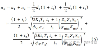 設計雙級傳動系統的功率分路數為 Nb,總傳動比為 i,第一級傳動比為 i1,第二級傳動比為 i2,輸入轉矩為 T1,則總中心距為: