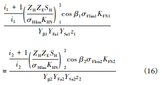 式中: σH1為第一級傳動比 i1 = 1 時第二級齒輪副的接觸應力; σHi為第一級傳動比為 i1 時第二級齒輪副的接觸應力。