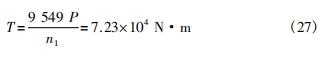 假定某直齒展開式減速器輸入功率為 25 000 kW,輸入轉速為 3 300 r/min,總傳動比 i = 18.33。齒輪材料為 20CrMnTi,滲碳淬火,表面硬化,4 級精度。則齒輪的許用接觸應力 σHlim = 1 050 MPa,許用彎曲應力 σFlim = 675 MPa。原動機與從動機工作特性為均勻平穩,且齒輪結構布局為對稱分布。輸入轉矩為: