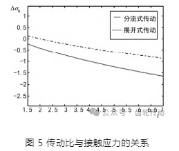 圖 5 給出了第二級齒輪副的接觸應力變化量 ΔσH 與第一級傳動比 i1 的關系。第二級齒輪副的接觸應力變化量計算公式如下: