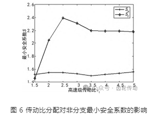 在傳動比對尺寸的影響方面: 增大第一級傳動比可以減小減速器重量。按最小重量(體積) 分配原則分配傳動比,所得減速器在軸的垂直平面內尺寸相對較小。在傳動比對安全系數的影響方面: 隨著第一級傳動比的增加,兩級齒輪傳動系統的接觸應力差值也隨之增加。傳動比對齒面接觸最小安全系數 SH 的影響較小,但對齒根彎曲最小安全系數 SF 的影響較大。
