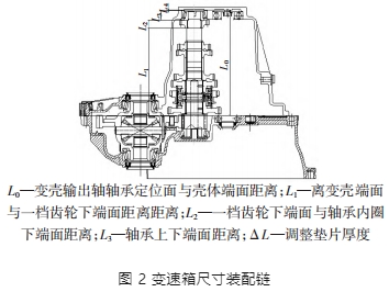 為了研究更加準確,選擇一款變速箱進行研究,通過分析變速箱的結構,了解各個零部件的裝配關系與傳動關系,剖析變速箱的執(zhí)行原理,得到影響墊片選擇和變速箱裝配的關鍵因素,對其進行參數分析,并建立裝配合適的裝配尺寸鏈。