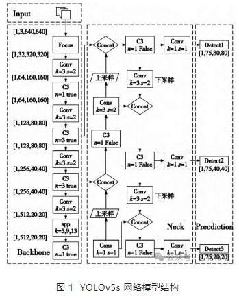 YOLOv5 包含 4 個版本的目標檢測網絡模型,即 YOLOv5s、YOLOv5m、YOLOv51 和 YOLOv5x,模型的規模和訓練參數的數量在 4 個版本中依次增加,其中,YOLOv5s 網絡模型最快。考慮到缺陷檢測需要嚴格的實時性,本文以最簡單、最快的網絡模型 YOLOv5s 作為基準,來完成表面缺陷的在線檢測。YOLOv5s 的結構由 4 部分組成,輸入端、Backbone 網絡、Neck 網絡、Prediction 輸出端,如圖 1 所示。輸入端采用自適應圖像填充、自適應錨框計算和 Mosaic 數據增強,以提升檢測的準確性; 在 Backbone 網絡中,使用了 Focus 模塊、C3 主干網絡模塊和卷積模塊。Focus 模塊主要用于切片操作,通過增加特征圖的維度來縮小特征圖的尺寸,同時保留圖像特征信息。C3 主干網絡模塊中的殘差結構有效防止梯度消失,使得特征更加細致; Neck 網絡中主要包含 C3 網絡模塊、上采樣和下采樣過程,降低計算量,同時提高特征融合能力和信息保留度。Prediction 輸出端中使用 NMS 后處理方法篩選多個目標錨框,抑制無效信息,以提高識別準確性。