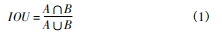 在 YOLOv5s 原有的 NMS 中,使用 IOU 度量來抑制冗余檢測框,IOU 的全稱為交并比,即表示為預測邊框 A(Prediction box) 和真實邊框 B(Ground truth box) 的交集和并集的比值。IOU 的計算公式為: