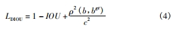 式中: Si 表示第 i 個檢測框對應的置信度得分,RDIOU ( M,bi ) 表示基于 DIOU 的檢測框交叉比,M 表示置信度得分最高的檢測框,bi 表示剩余檢測框集合中的第 i 個檢測框,Nt 表示設定的閾值。本文 DIOU 損失函數的懲罰項可以定義為: