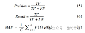 式中: TP 表示正確識別齒輪缺陷,FP 表示對齒輪缺陷識別的錯誤分類,FN 表示不明齒輪缺陷,C 表示齒輪缺陷對象類別的數量,k 表示 IOU 閾值,N 表示閾值的 IOU 數量,P(k) 表示識別精度,R(k) 表示召回率。