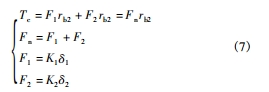 如圖 2a 所示,當主動輪順時針轉動時,齒對 1 首先進入嚙合承擔載荷,由于齒對 2 主動輪處存在修形齒廓,當齒對 1 沿嚙合線方向的變形量 δ1 大于齒對 2 處主動輪的齒廓修形量 Δ1 時,齒對 2 將進入嚙合并參與傳動,此時兩對輪齒共同承擔負載扭矩 Tc,并在嚙合線方向上的兩處作用點產生嚙合力 F1、F2,根據力矩平衡和廣義胡克定律可得:
