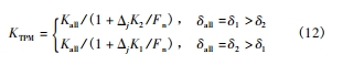 將式(8) 轉化為關于變形量 δ1 的表達式,并代入式(11) ,可推導得出圖 2a 所示齒對承載接觸狀態下的修形齒輪嚙合剛度 KTPM,即式(12) 中條件為 δall = δ1 > δ2 的表達式; 同樣地,如圖 2b 所示的齒對承載接觸狀態,此時齒對 2 沿嚙合線方向的變形量 δ2 即為整體嚙合變形量 δall,即 δall = δ2 > δ1,同理可推導出相應的修形齒輪嚙合剛度 KTPM,即式(12) 中條件為 δall = δ2 > δ1 的表達式。因此,圖 2 所示齒對承載接觸狀態下的修形齒輪嚙合剛度 KTPM可寫為: