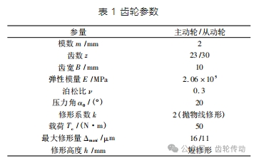 式中: Δmaxi、ci 分別為最大修形量與修形修正量(i 為 1、2,用以區分參與嚙合的主/從動輪) ,相應的主/從動輪修形修正量 c1、c2 分別取 9 與 4 ,Ft 為接觸點的圓周力,B 為齒輪寬度。